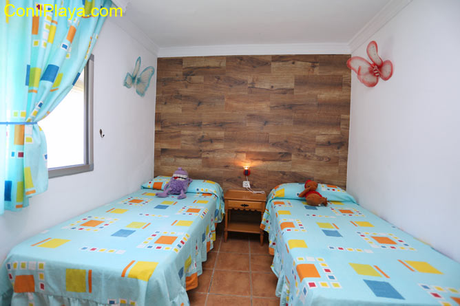 Tiene una habitación con una cama de matrimonio y una cama supletoria. Otra habitación con dos camas individuales y otra supletoria.
