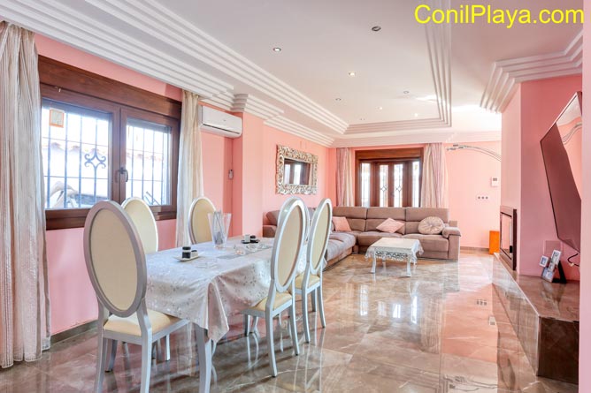 - Salón-Comedor: Amplio, con sofá tipo chaise-longue y mesa de comedor, chimenea