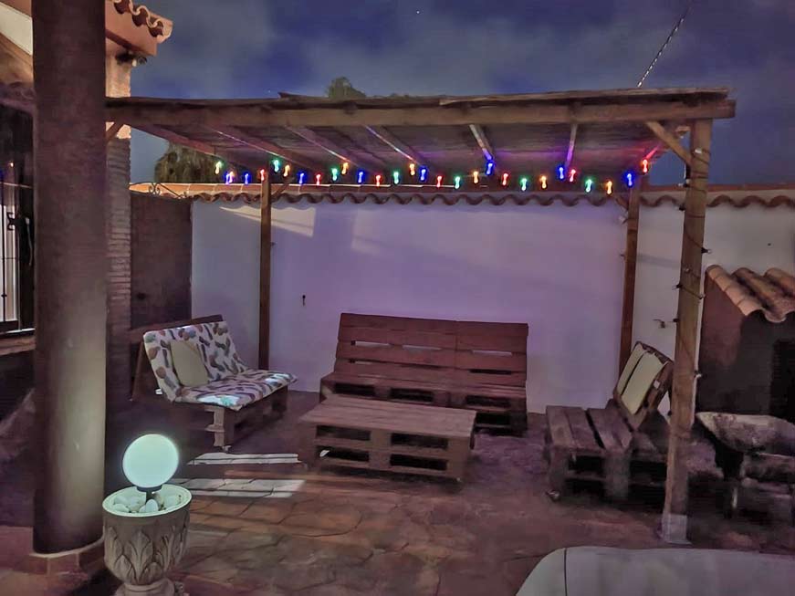 Junto al porche delantero se encuentra la zona chill-out techada, estupenda para relajarse en las noches de verano de Chiclana.