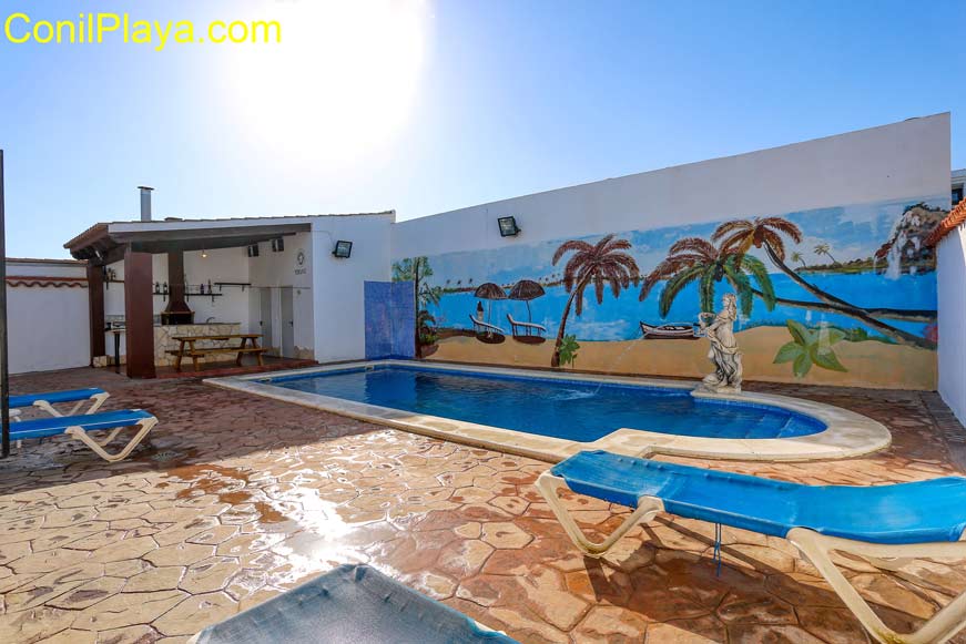 La piscina es privada y junto a ella se encuentra la barbacoa techada y un merendero con toldo.