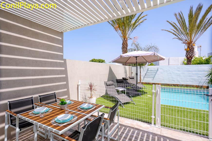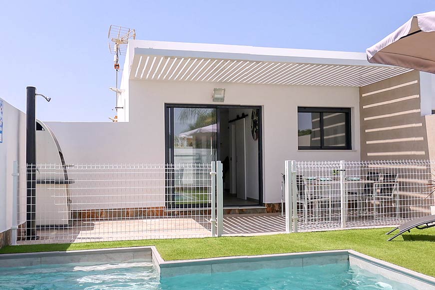 La casa es de nueva construcción y consta de 2 dormitorios con armarios, 1 cuarto de baño, cocina - salón - comedor y amplia terraza con barbacoa y toldo.