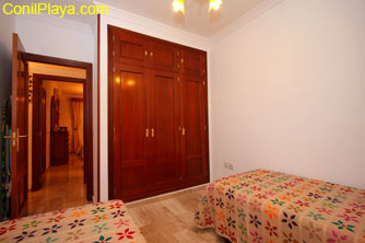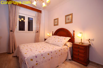 El dormitorio principal dispone de cama de matrimonio y de dos armarios empotrados, además cuenta con un cuarto de baño dentro de la habitación, el segundo dormitorio cuenta con dos camas individuales y también con un armario, el tercer dormitorio dispone de 2 camas, una de ellas aparece plegada en la foto. Todos los dormitorios tienen ventanas al exterior, es muy tranquilo.
