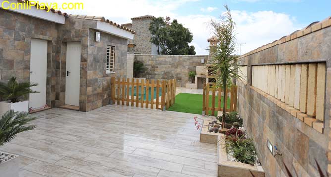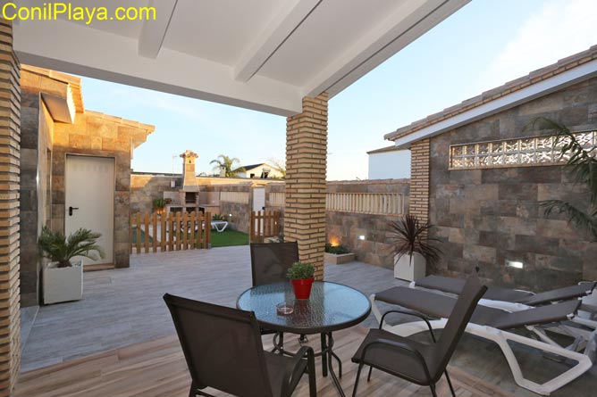 El apartamento en Conil tiene porche y piscina privada vallada.
