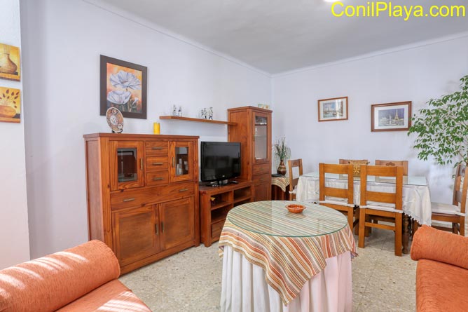 El apartamento en Conil consta de 3 dormitorios con armarios, salón - comedor con aire acondicionado, cocina completamente equipada y un baño.