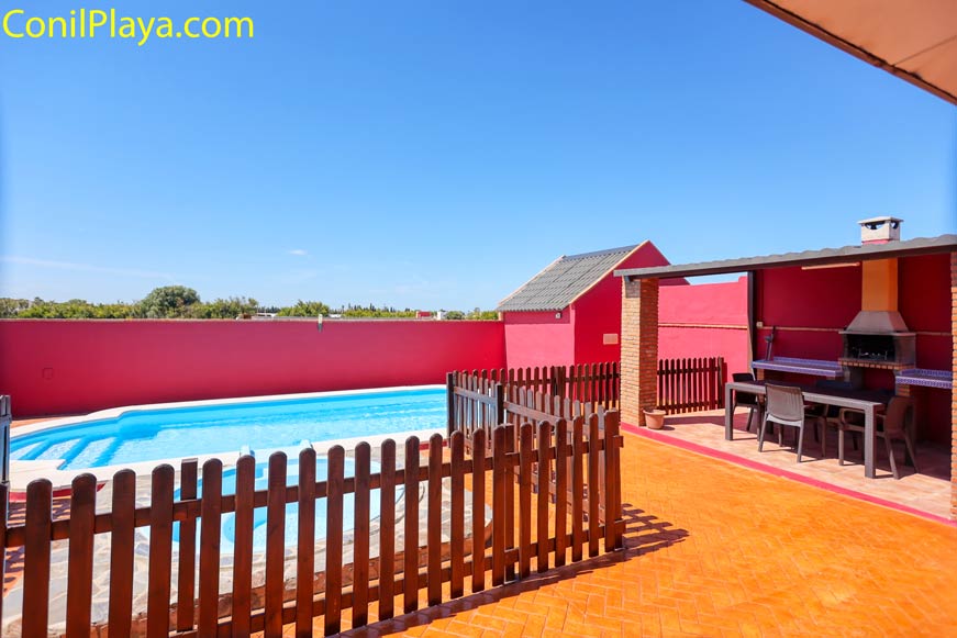 Es un alojamiento para vacaciones situado en una amplia parcela con un patio dónde se encuentra la barbacoa techada y la piscina vallada.