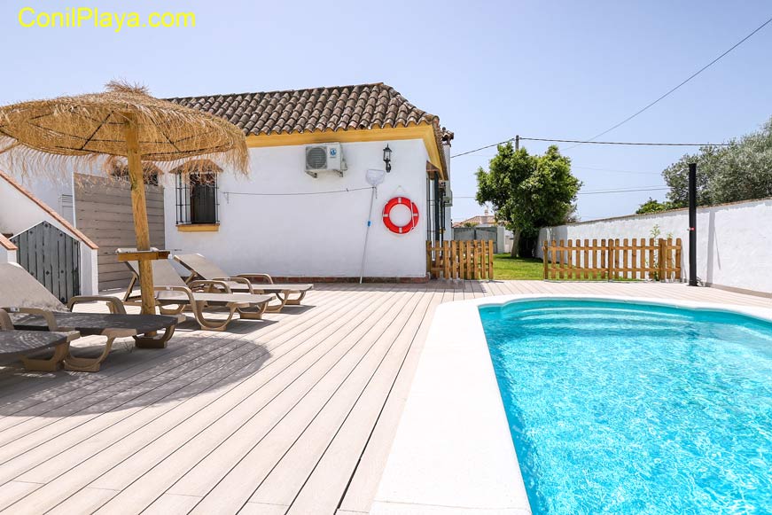 El chalet en Conil con piscina se encuentra en la carretera de Las Parcelas, en dirección al pinar de Roche, en una zona muy tranquila y a unos 10 minutos de Conil (7.6Km).