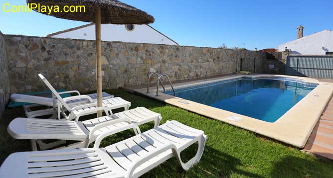 Se trata de un estupendo chalet en Conil con piscina privada en alquiler para vacaciones o para pasar el verano a unos 3 minutos en coche del pueblo (1833 metros) y a 6 minutos de la playa de La Fontanilla (3460 metros) y las playas de Roche.