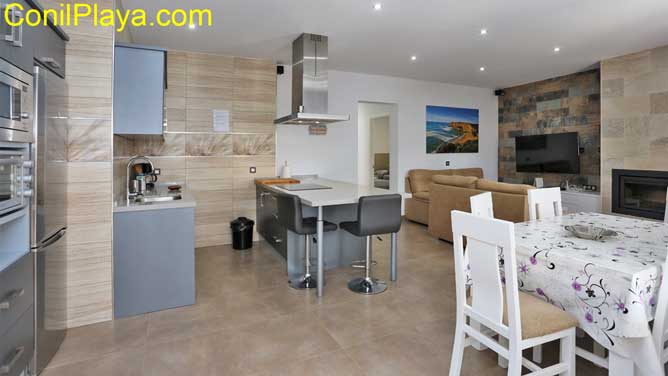 - Salón: Amplio con chimenea y gran pantalla de TV