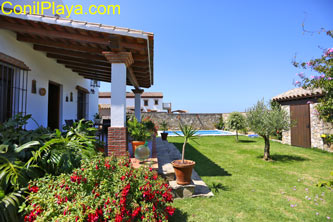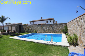 Alquiler de chalet con piscina privada en Conil, muy cerca de las calas de Roche y de la playa de la Fontanilla. La playa más cercana es la Cala del Puntalejos.