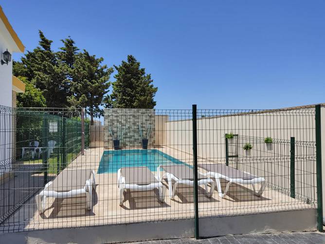 Se trata de un estupendo chalet con piscina privada vallada y con escalones de bajada, con un amplio jardín (250 m²), situado en una zona muy tranquila de El Palmar y a unos 10 minutos andando de la Playa.