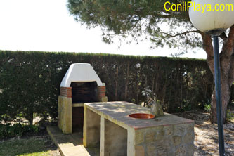 Cuenta en su exterior de porche con mesas y sillas, barbacoa y un amplio jardín con tumbonas.