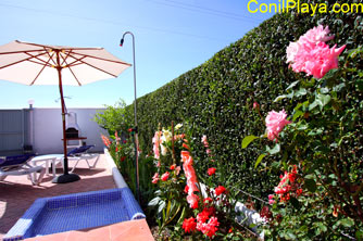 Dispone de un amplio patio con jardín y ducha exteripor, tumbonas y sombrillas.