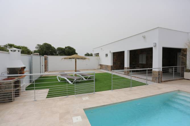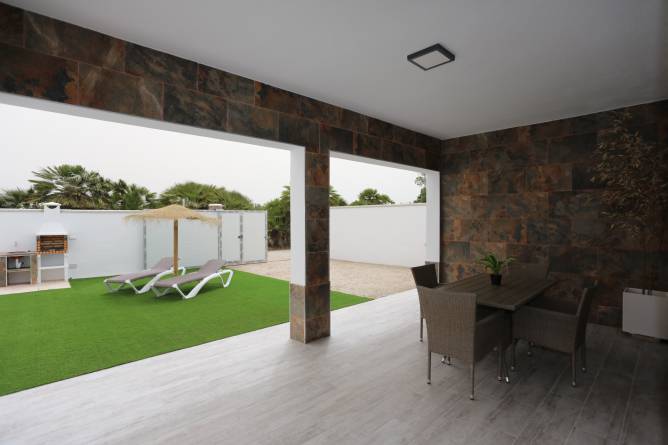Dispone de un magnífico porche delantero con una amplia mesa, jardín con barbacoa, además de la piscina, la cual tiene escalones de acceso.