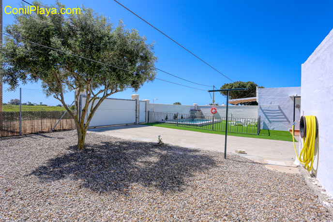 El aparcamiento es privado en el interior de la parcela, aunque también puede dejarlo en el exterior, tiene cancela de entrada a la propiedad.