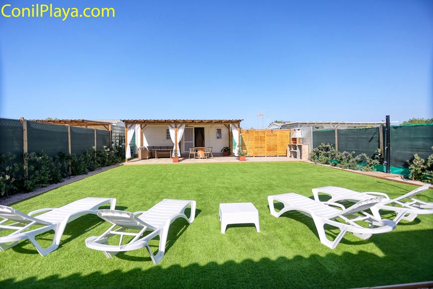 - Jardín: Espacio privado con césped, tumbonas y ducha exterior.